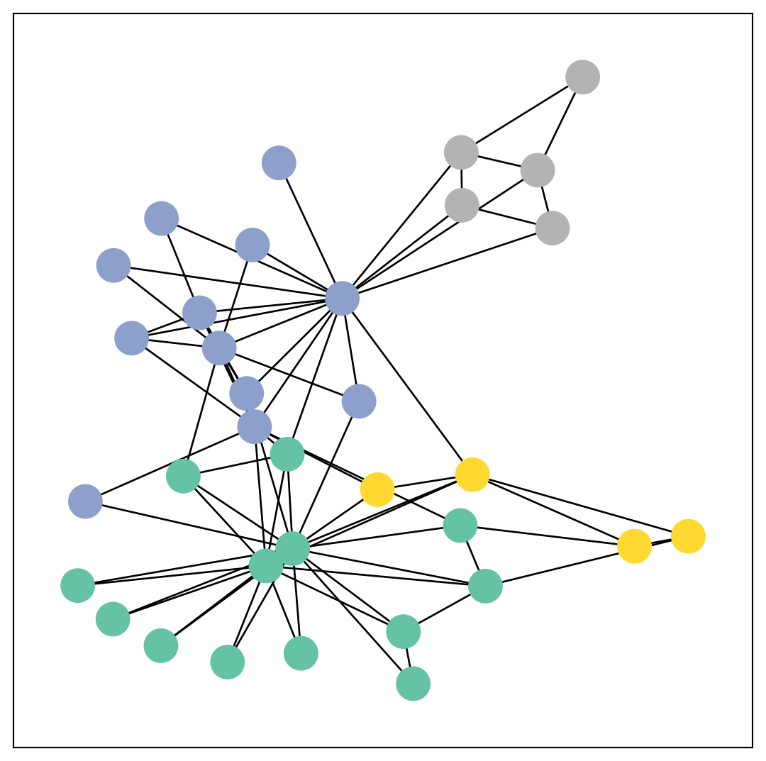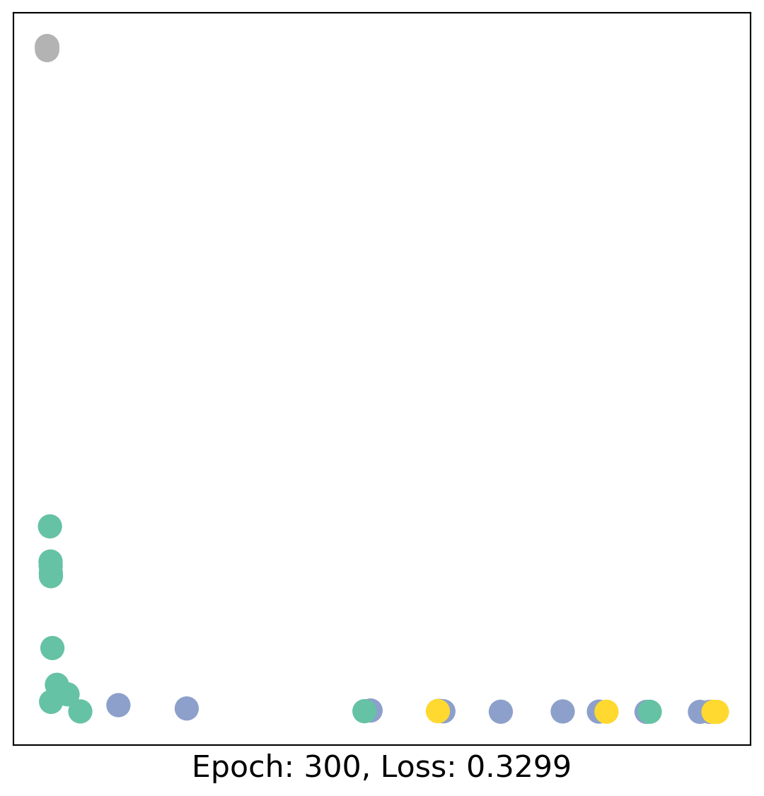 After that, we apply a single linear transformation (torch.nn.Linear) that acts as a classifier to map our nodes to 1 out of the 4 classes/communities.