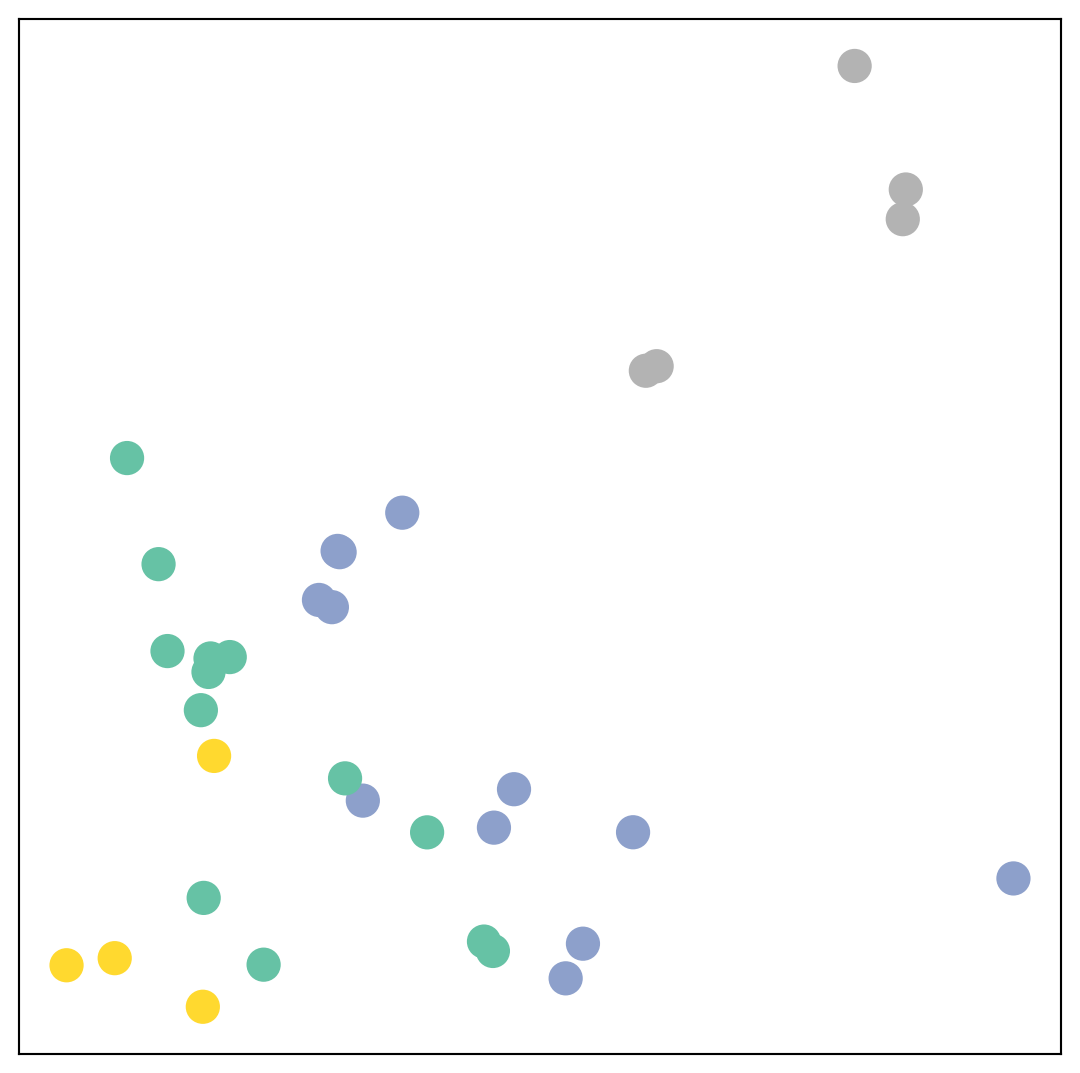 Nodes of the same color (community) are already closely clustered together in the embedding space, although the weights of our model are initialized completely at random and we have not yet performed any training so far!