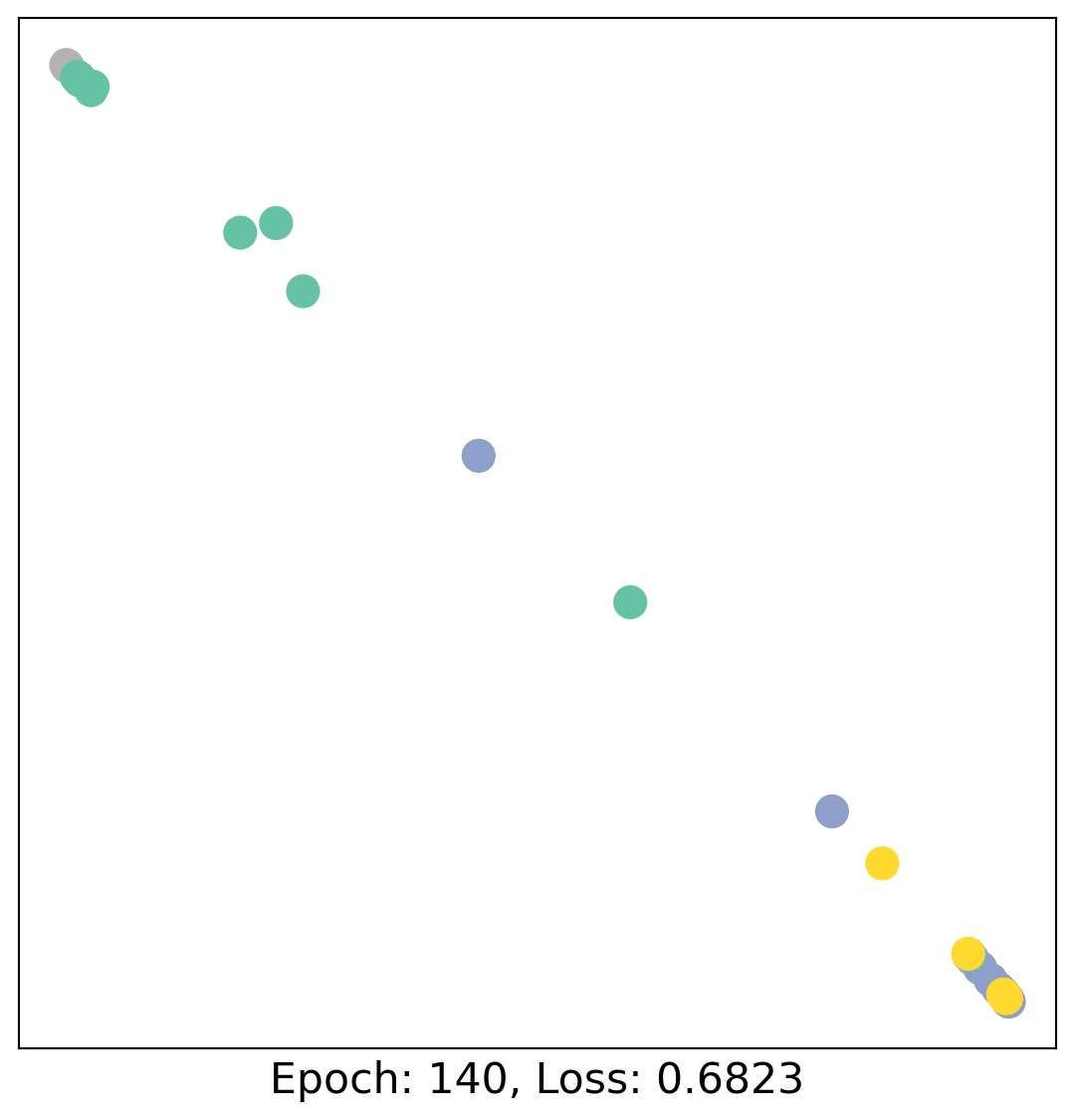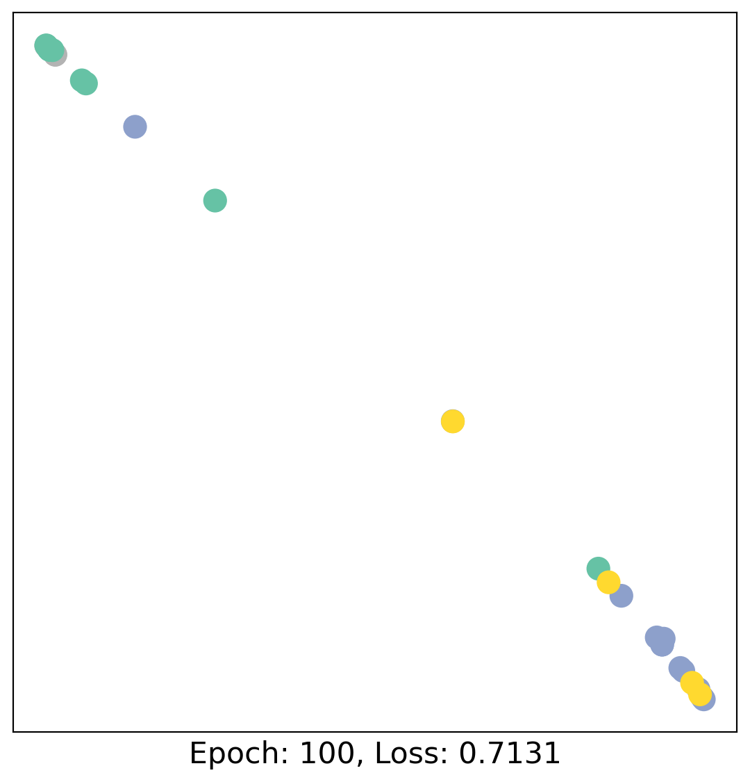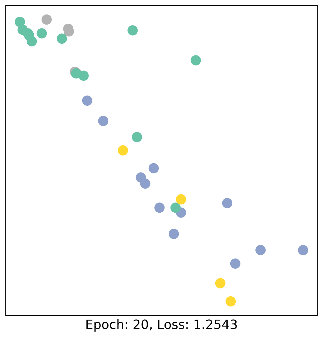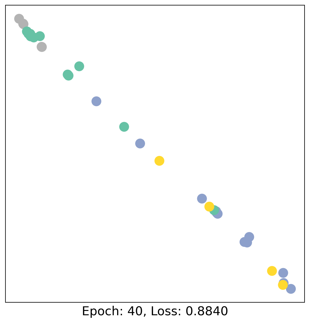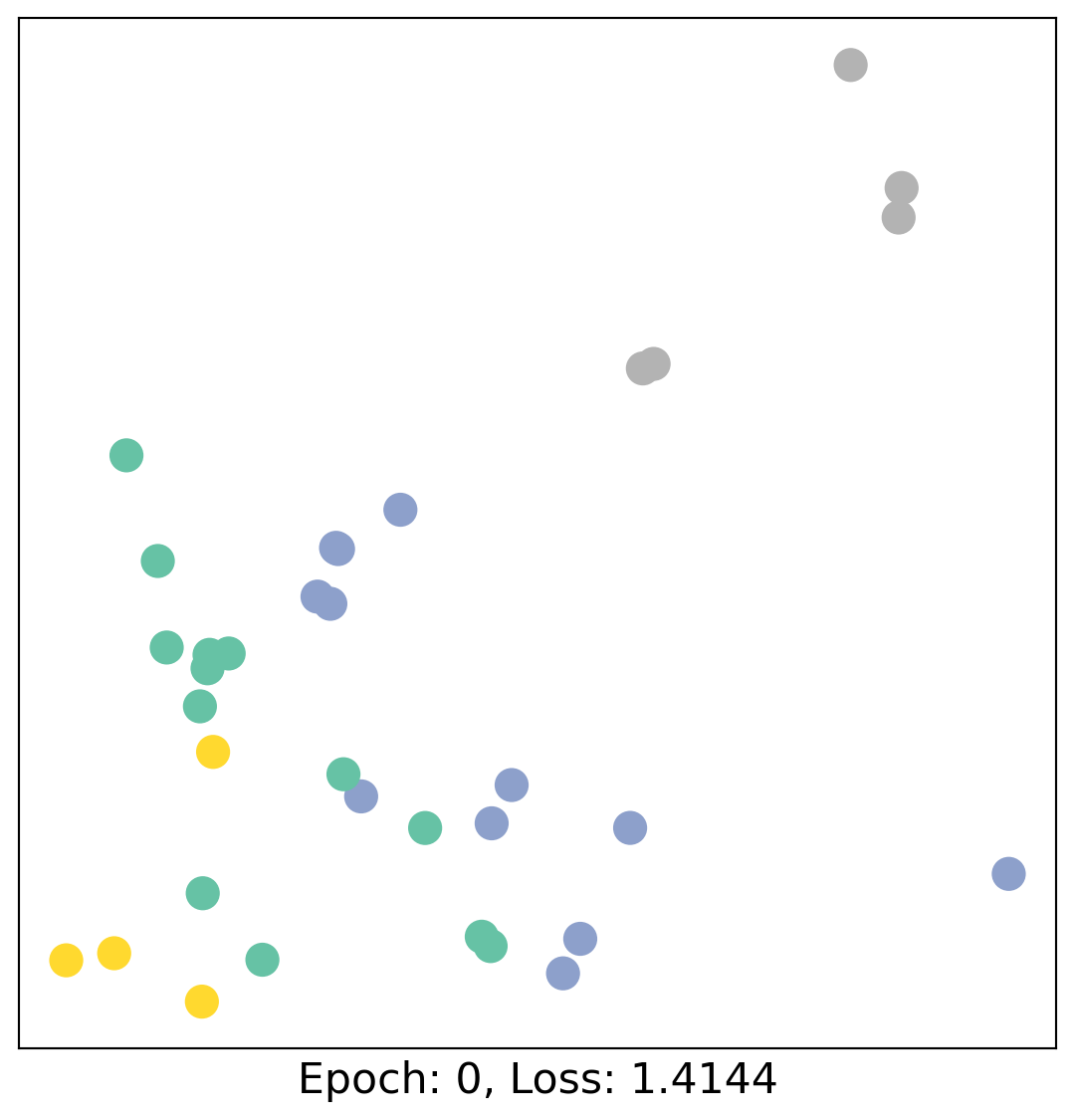 Let us now start training and see how our node embeddings evolve over time (best experienced by explicitely running the code):