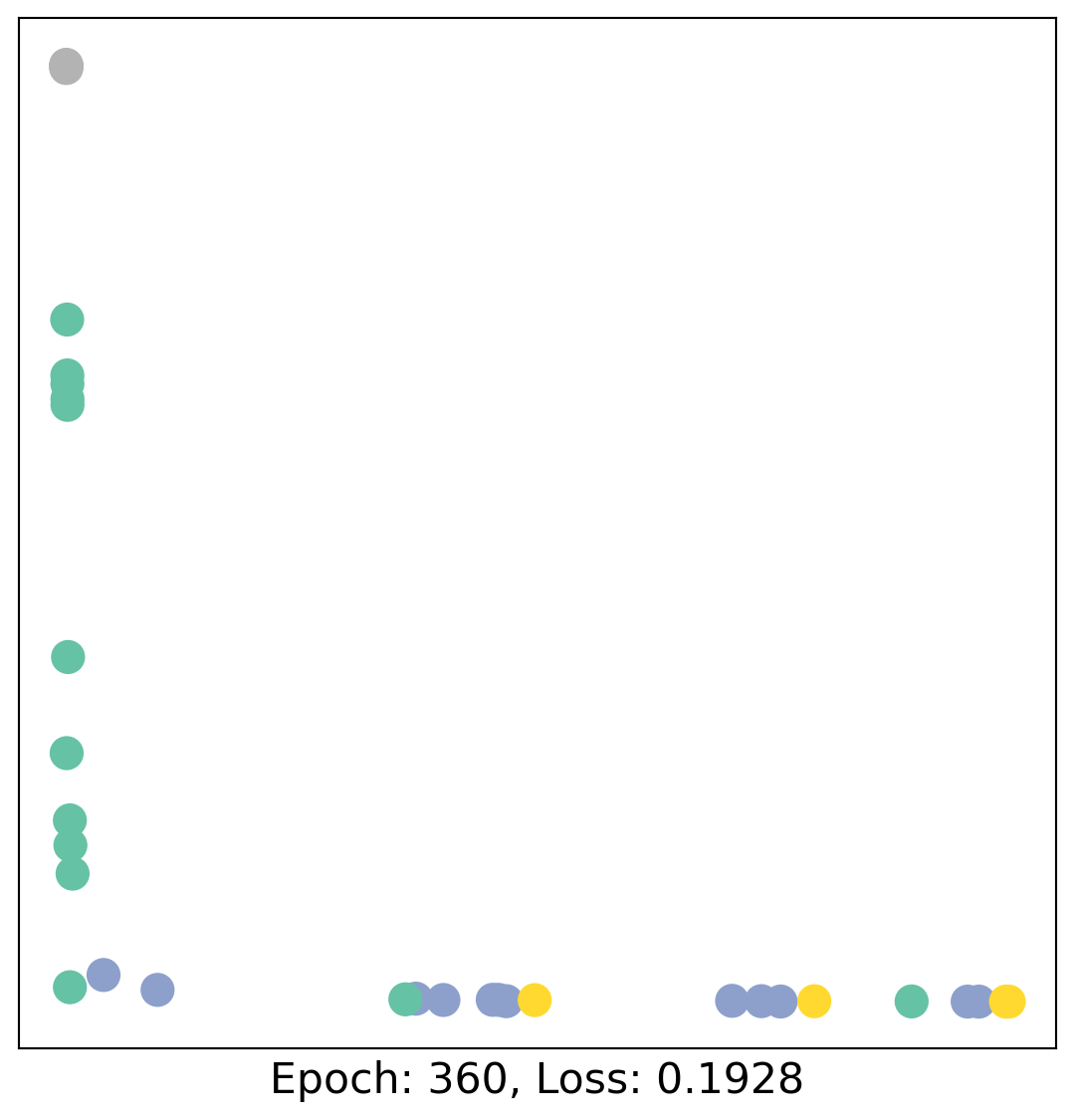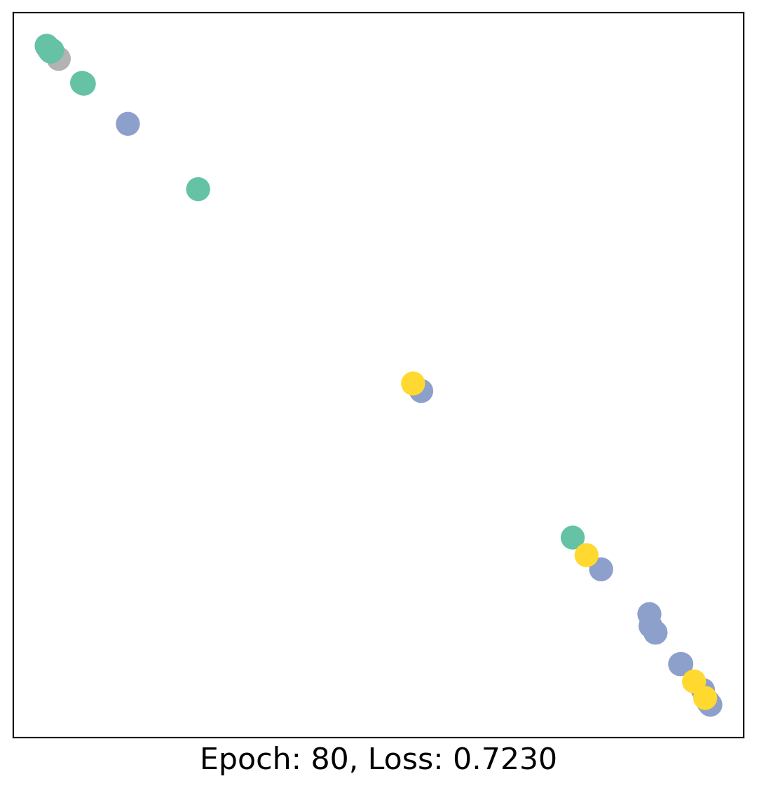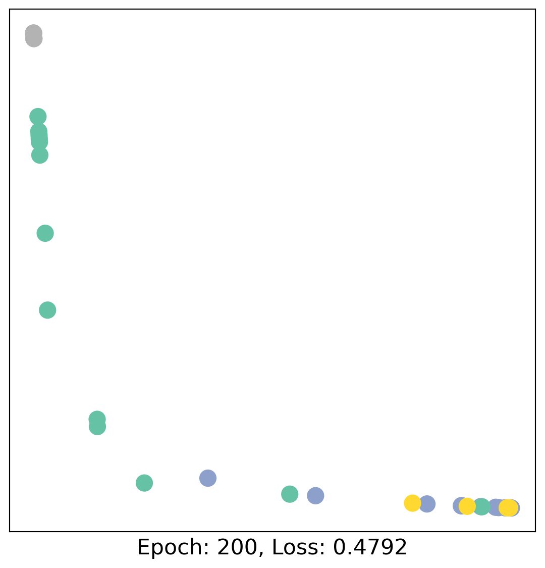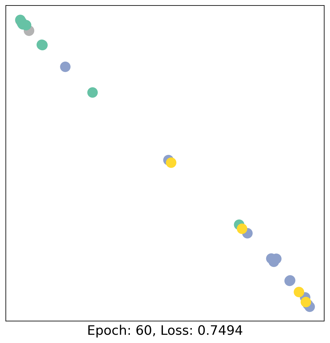 Let us now start training and see how our node embeddings evolve over time (best experienced by explicitely running the code):