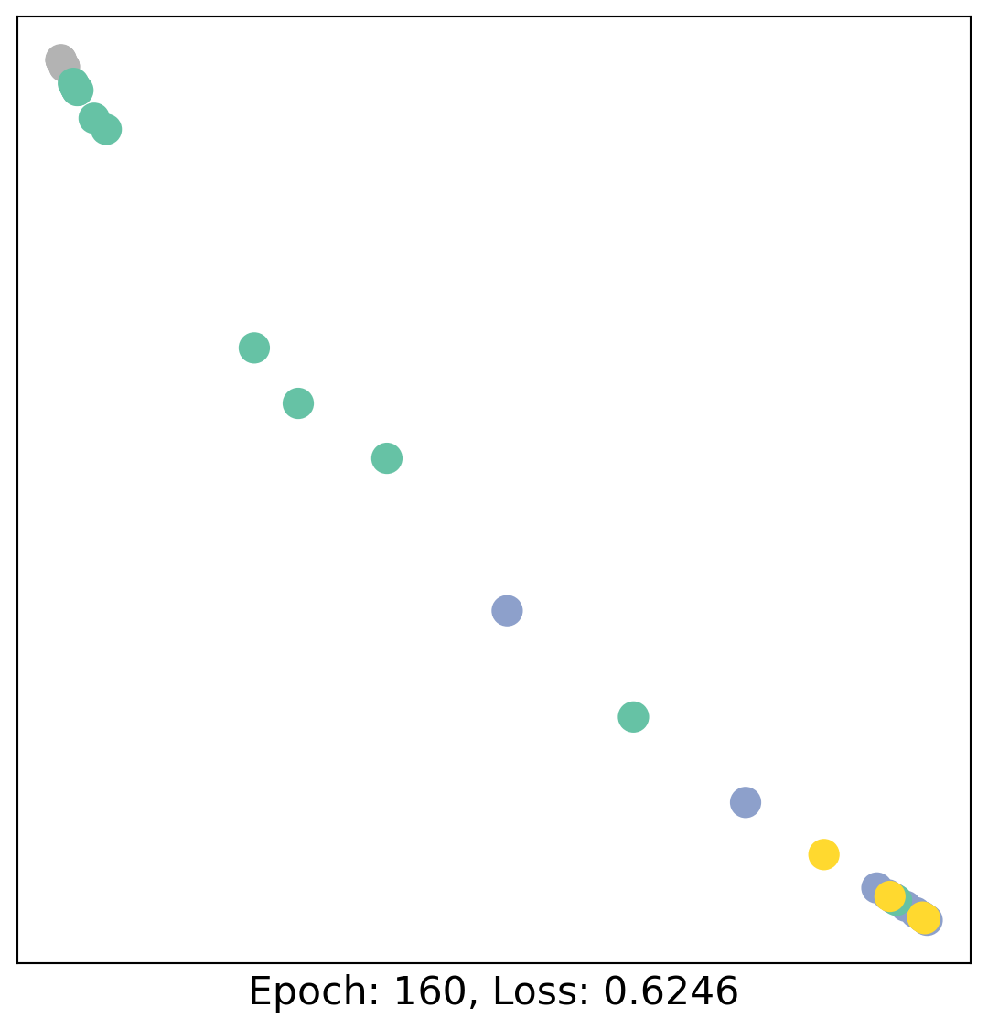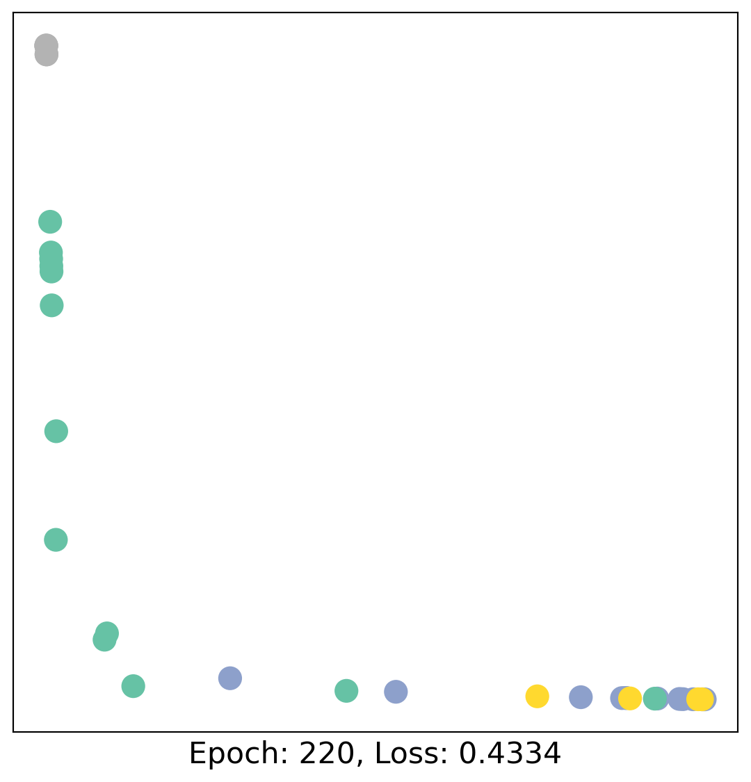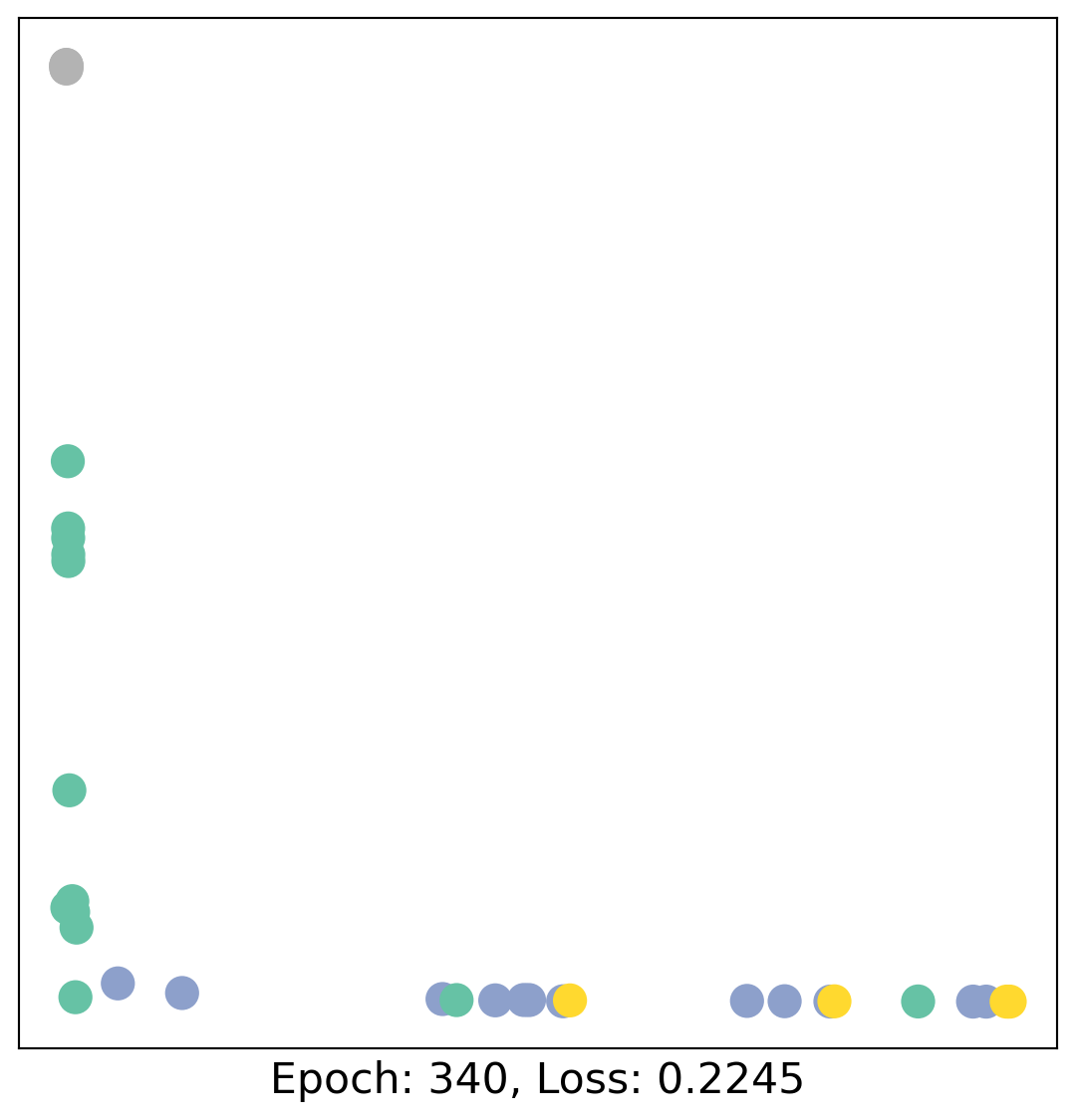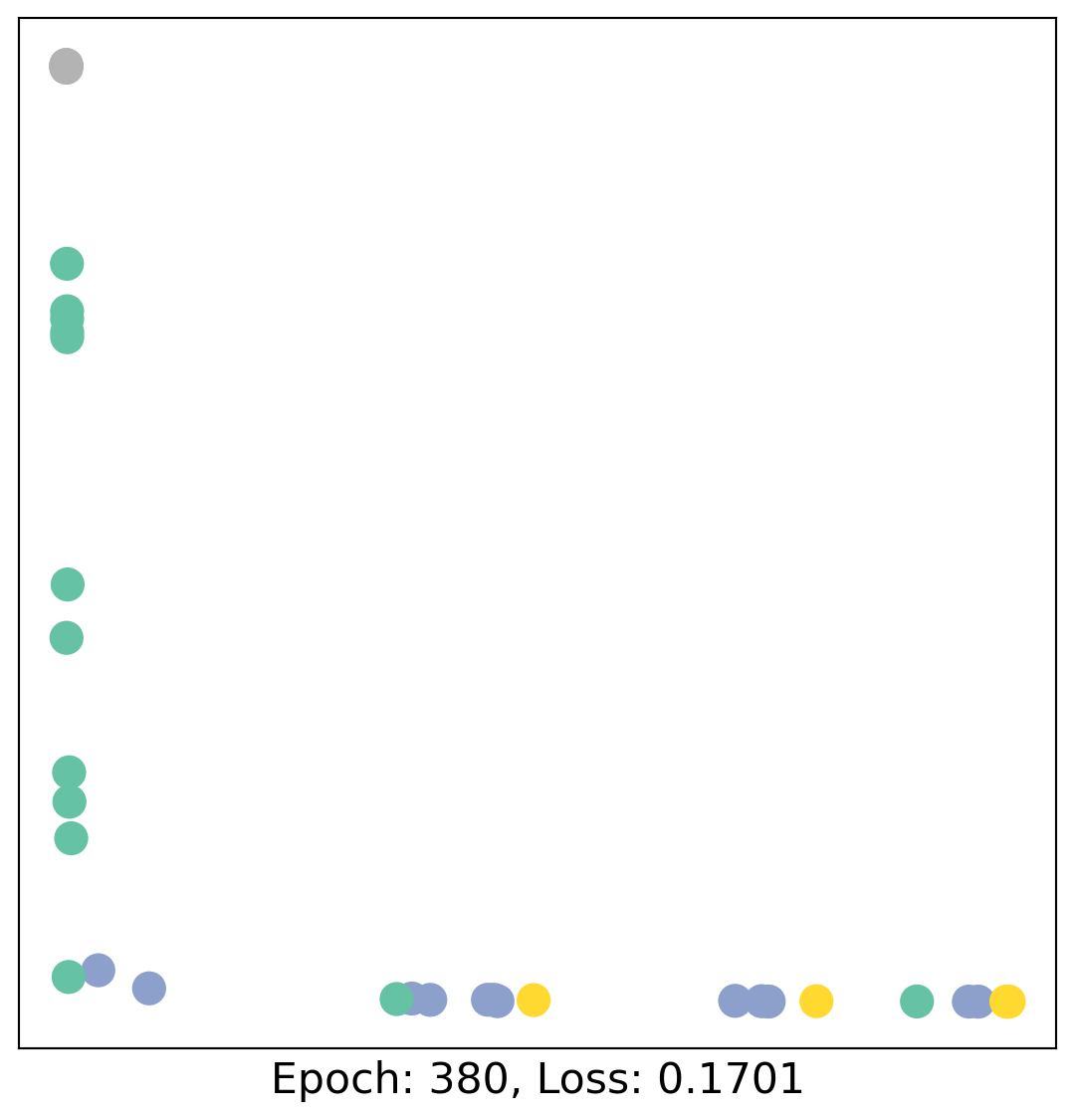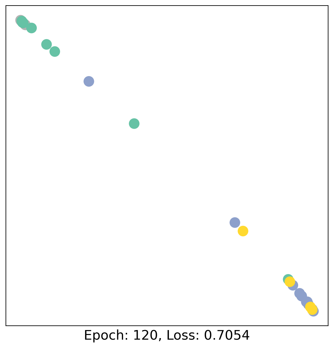 Let us now start training and see how our node embeddings evolve over time (best experienced by explicitely running the code):