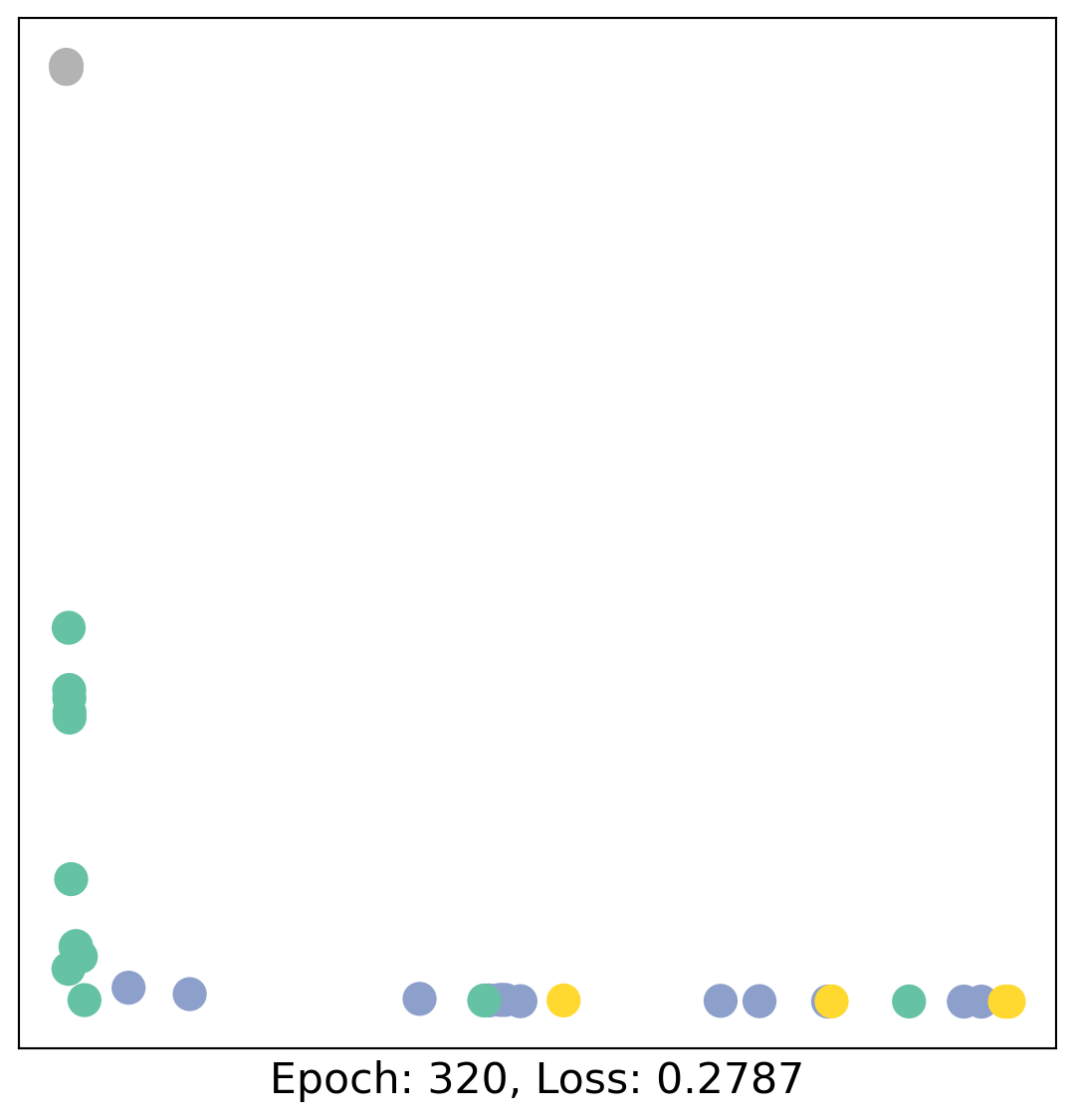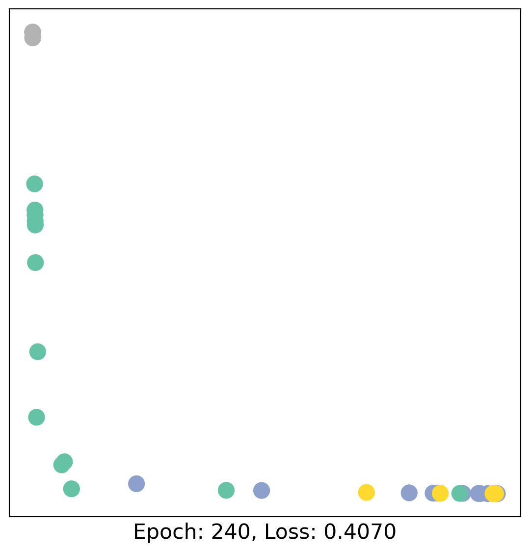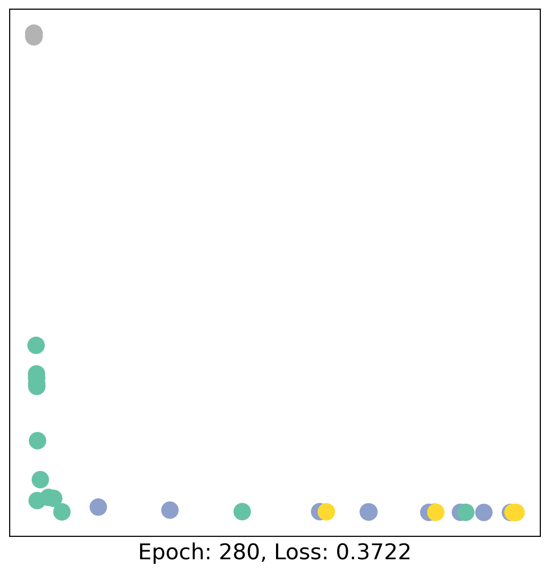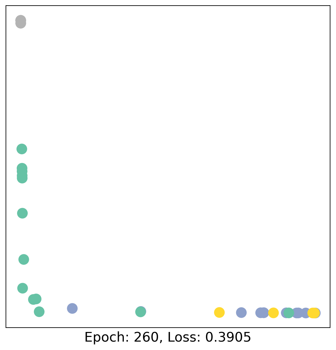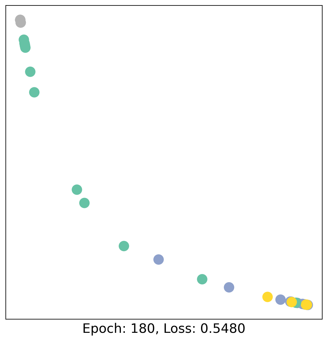 Let us now start training and see how our node embeddings evolve over time (best experienced by explicitely running the code):