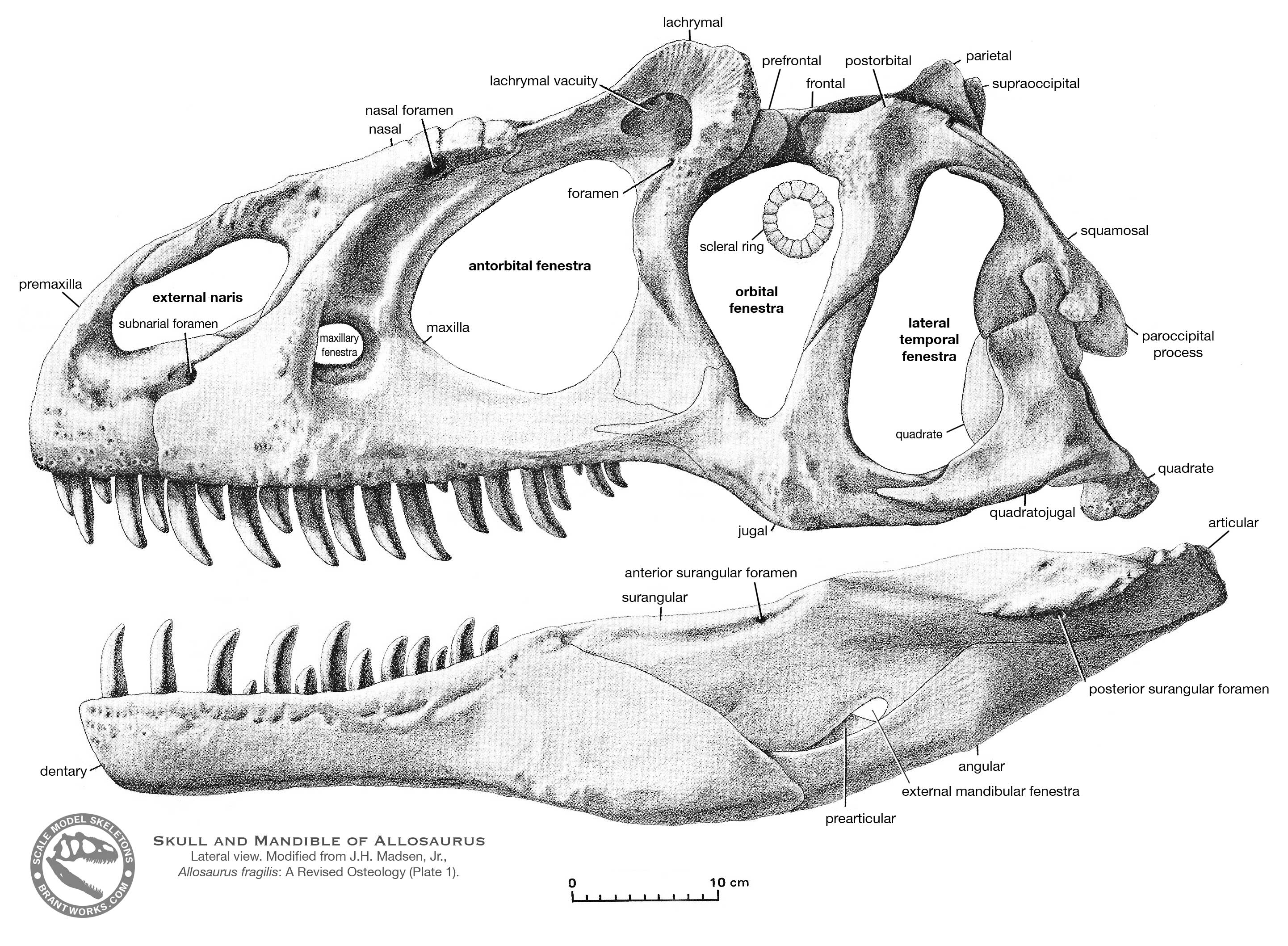 Carnosaurs are known for having large eye sockets and a long, narrow skull.