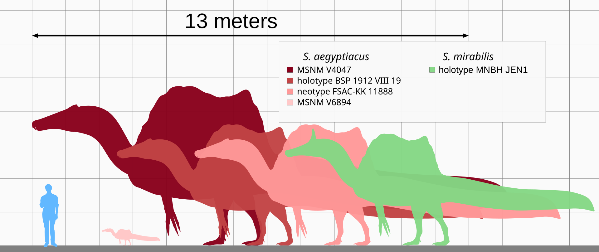 Spinosaurus (a genus within Spinosauridae) is among the largest known terrestrial predators in the fossil record, having reached lengths of up to 14 meters.