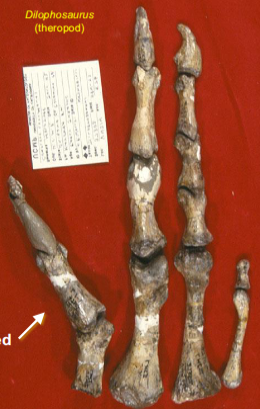 The enlarged and offset thumb of Dilophosaurus, a theropod. Air sacs in the body cavity: these air sacs were connected to the lungs, characterizing a bird-like respiratory system. This allowed saurischians to develop massive body sizes while reducing the weight of the skeleton, and also increased oxygen efficiency by providing a highly efficient, single-direction airflow (similar to that of modern birds).