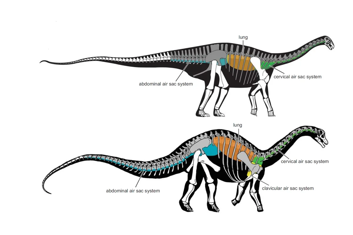 Air sac systems in Nigersaurus and Saltasaurus, both sauropods. While sauropods included the largest land animals to ever walk the planet, their bodies were surprisingly light, as a result of their air sac systems.