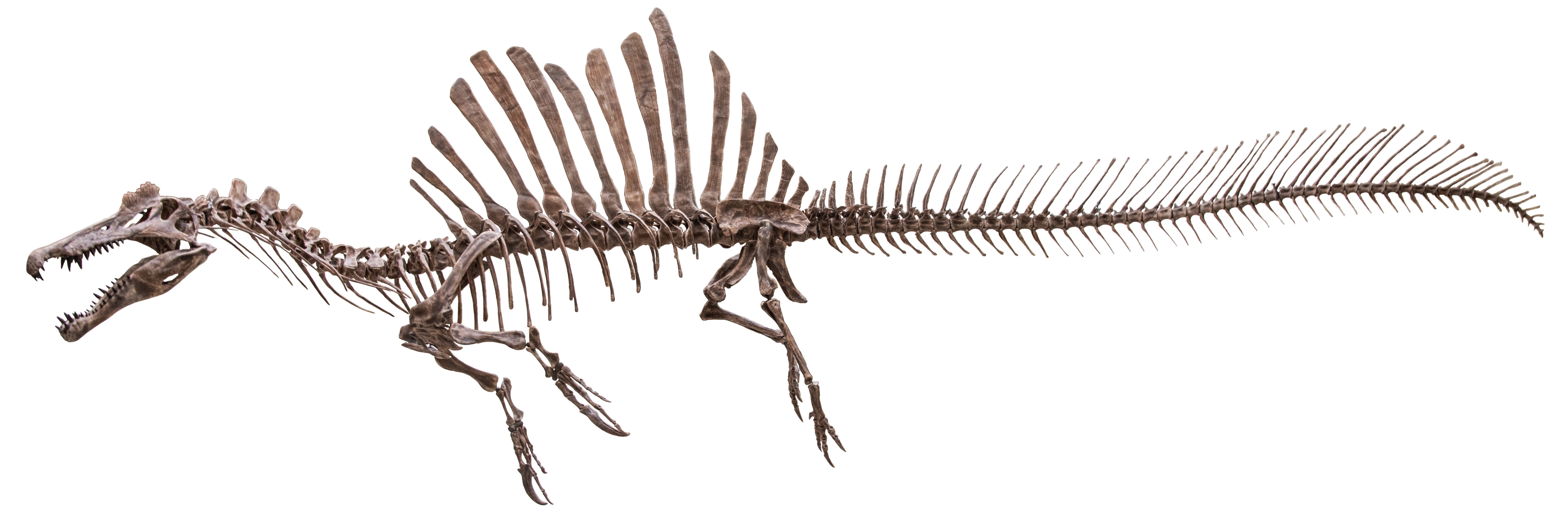 Spinosauridae is the clade of tetanuran theropod dinosaurs that includes the famed Spinosaurus. Spinosaurids were large, bipedal carnivores who had long, low, and narrow crocodilian-like skulls with conical teeth. In many species, the neural spines of the vertebrae were elongated to form a sail on the animal’s back.